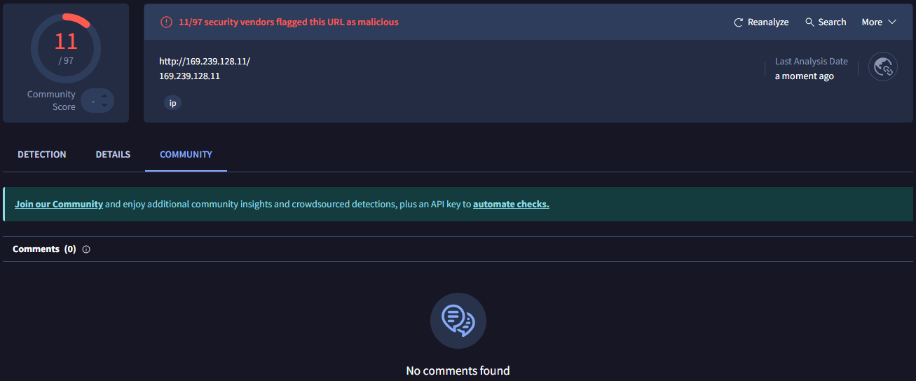 Q3: Still in Virus Total, under Community, what threat group is attributed to this IP address?