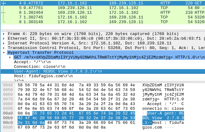 One of the alert signatures shows “USER_AGENTS”, so I opened it in Wireshark to see the related packets. I opened an HTTP get packet and found the user agent to be REBOL View 2.7.8.3.1