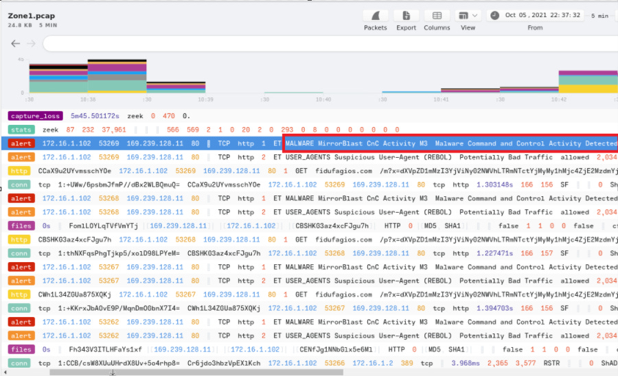 I put the .pcap in to brim to see the alerts, and we didn’t even have to do any filtering. We were able to see the alert signature we needed right away.